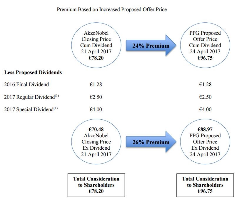 PPG于4月24日宣布,公司已于2017年4月24日再次向阿克苏诺贝尔(AkzoNobel)提出修订后的并购要约,将以每股96.75欧元(含股息,包括每股现金61.50欧元加0.357股PPG股票)的价格收购阿克苏诺贝尔的全部普通股。计入净债务和少数股东权益,拟议收购对价约为269亿欧元,即288亿美元。