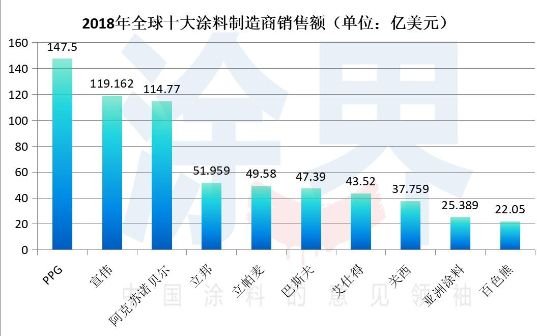 榜单显示,美国PPG以销售额147.5亿美元位列排行榜榜首,美国宣伟(Sherwin-Williams)则以119.162亿美元位居第二位,荷兰阿克苏诺贝尔(AkzoNobel)以销售额114.77亿美元紧随其后,立邦、立帕麦、巴斯夫、艾仕得、关西、亚洲涂料、百色熊依次位列第4-10位。
