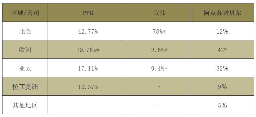 PPG、宣伟、阿克苏诺贝尔区域销售分布(基于2017年度数据)