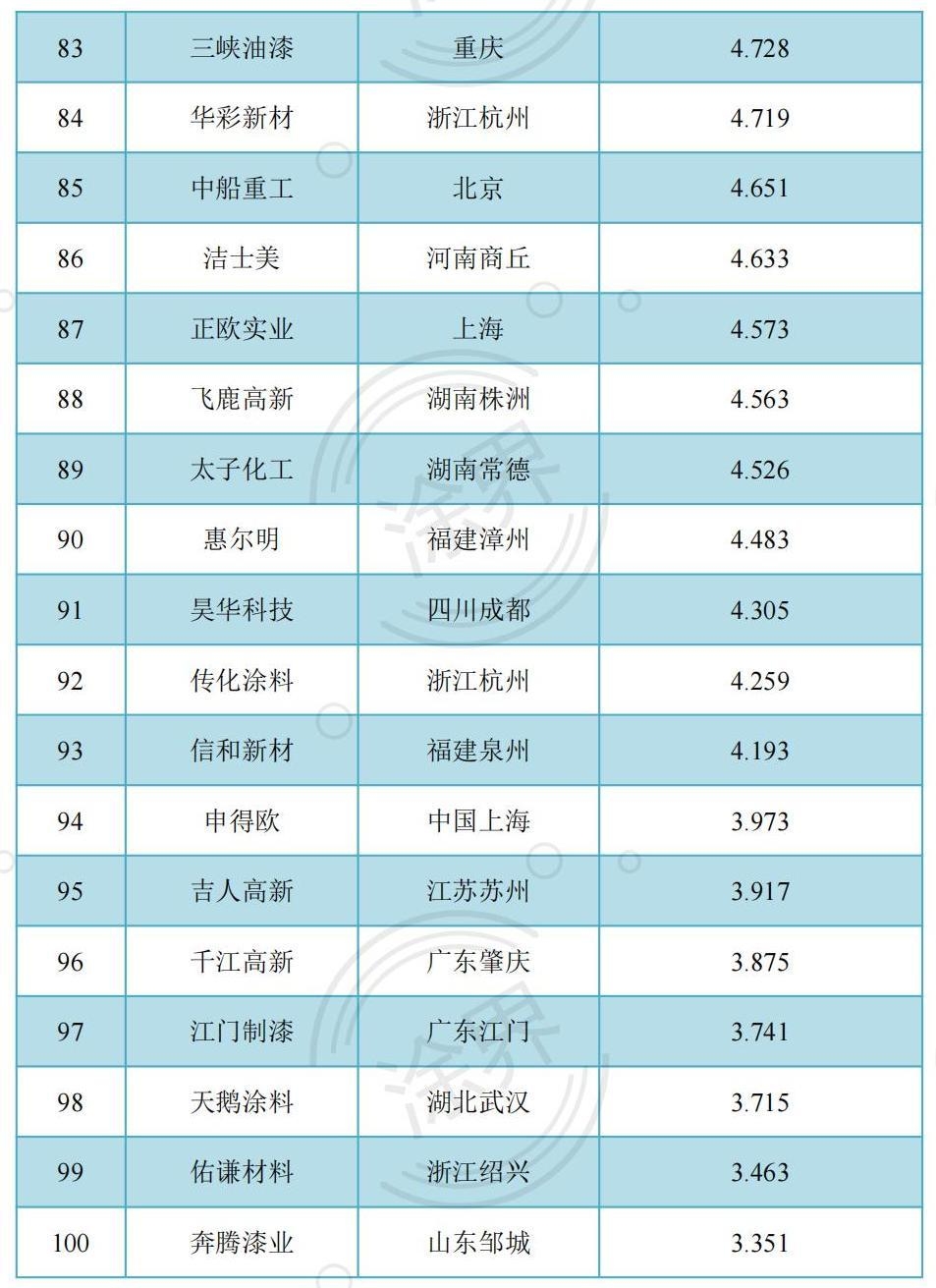 5、榜单前100名公司排名主要包括上市公司(含母公司为上市公司、新三板公司),以及愿意披露和向《涂界》申报其年度销售收入的公司。它包含了大多数相关的公司,但私人控制着可能跻身中国涂料企业100强排行榜的公司,比如邦固化学、慧谷化学、虎皇新材、武进晨光、深展实业、绿树涂料、晨光涂料、荣昌新材、长江涂料、光辉化工、维新制漆、圣光化工等一批非上市涂料公司,以及含有防水涂料业务的卓宝科技、宇虹防水、雨中情、宏源防水等防水企业,因为它们的确切销售数据未知,暂没有被纳入榜单。