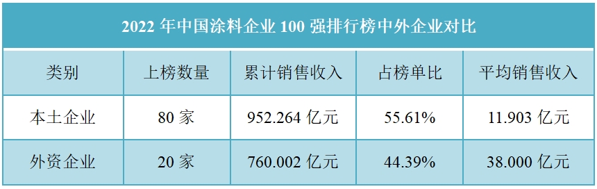 ◎前10强企业中,外资企业占据了6席,本土企业仅占4席,上榜数量较往年未发生变化。本土企业排名第一的三棵树与立邦的销售收入相差127.159亿元,差距较上年有所增大。