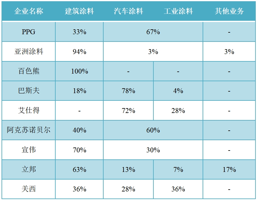 亚洲涂料2022年建筑涂料占比94%,工业涂料占比仅为3%,其他业务占比3%。关西涂料2022年建筑涂料占比约36%,汽车涂料占比28%,工业涂料占比36%。艾仕得2022年汽车涂料销售占比71.70%,工业涂料销售占比28.30%。百色熊2022年建筑涂料业务占比高达近乎100%。