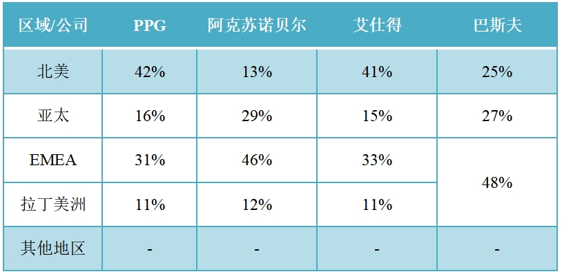 巴斯夫涂料业务全球分布也比较均衡,其中:从欧洲地区占比30%,北美地区占比25%,亚太地区占比27%,南美/非洲/中东地区占比18%。艾仕得业务全球分布也比较均衡,其中:北美地区占比41%,欧洲/中东/非洲地区(EMEA)占比33%,亚太地区占比15%,拉丁美洲占比11%。