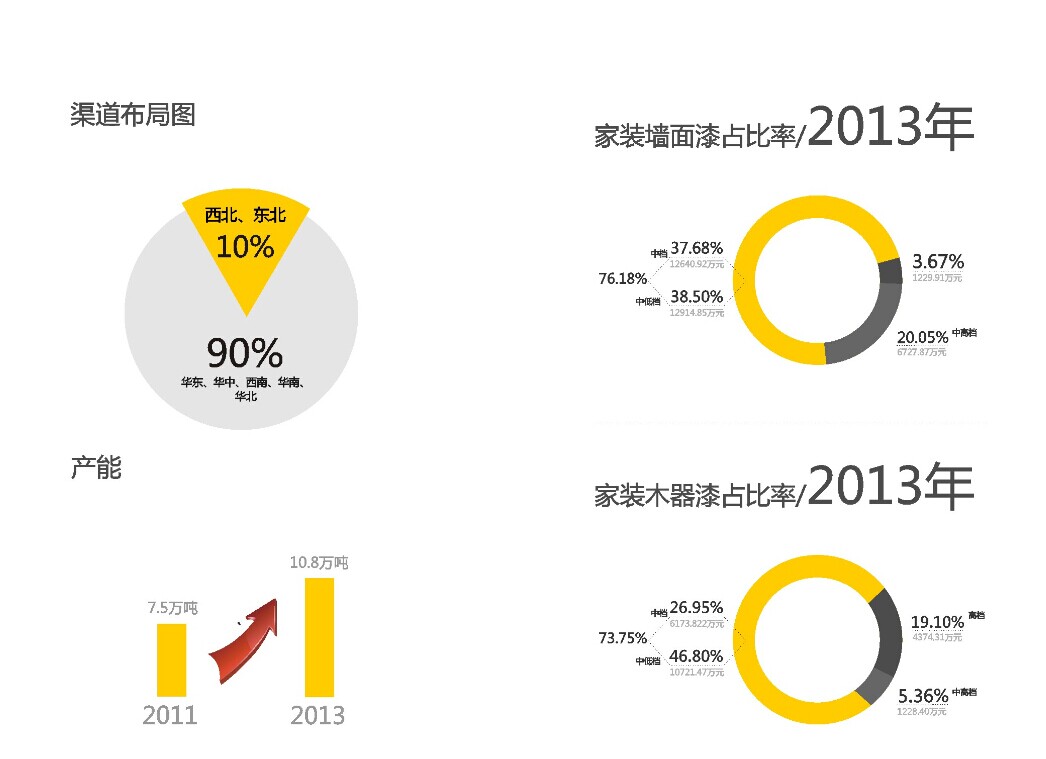 在家装墙面漆方面,2013年,高档产品销售收入为1229.91万元,占比3.67%;中高档产品销售收入为6727.87万元,占比20.05%,而中档、中低档产品销售收入分别为12640.92万元、12914.85万元,分别占比为37.68%和38.50%,整个中低档产品占比达到了76.18%。
