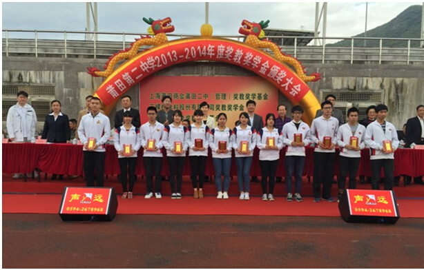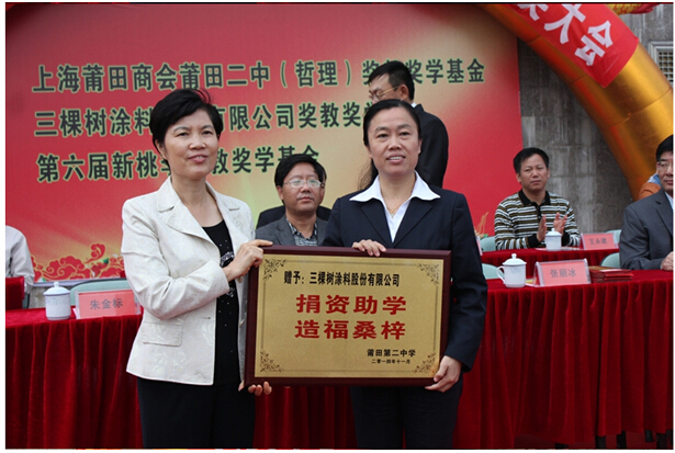 11月15日,莆田二中2013-2014年奖教奖学金颁奖大会在莆田二中大操场隆重召开,莆田市副市长张丽冰等领导出席了大会。三棵树副总裁徐荔芳出席并代表三棵树向莆田二中捐赠奖教奖学金105万元。奖教奖学金将分三年捐赠,今年捐赠35万元。