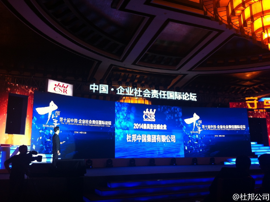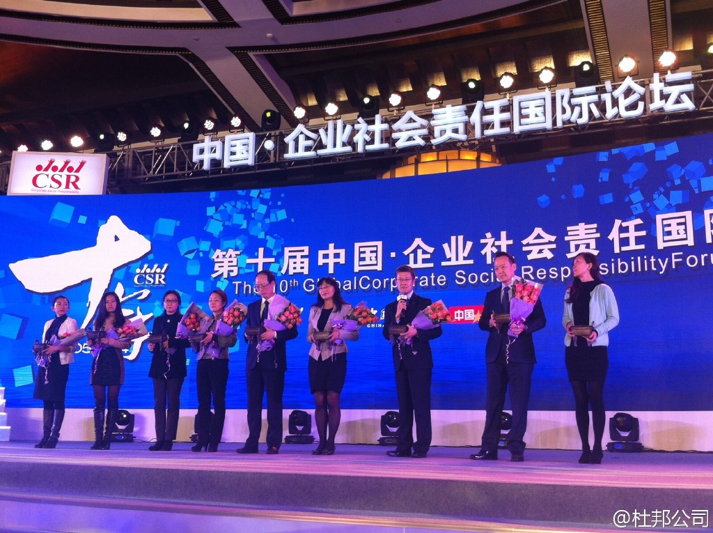 12月11日,由中国新闻社旗下中国新闻周刊主办的第十届“中国•企业社会责任国际论坛”暨“2014责任中国荣誉盛典”在北京钓鱼台国宾馆召开。杜邦中国集团有限公司被授予“2014最具责任感企业奖”。杜邦北亚及澳新地区企业传播事务总监徐俊代表杜邦公司出席活动。
