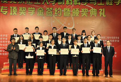 12月3日上午,2014年度北京化工大学材料科学与工程学院专项奖学金签约暨颁奖典礼在北京化工大学科学会堂举行。据悉,“北京化工大学东方雨虹专项奖学金”设立于2008年,旨在帮助家庭困难的有志青年和品学兼优的优秀学生顺利完成学业,促进校企双方在技术、人才方面的交流与合作,每年约有30名品学兼优的学生得到此项奖学金的资助。