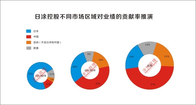 在2014财年,日本本土的销售额占日涂控股全年销售额的比例达到72%。按照日涂控股的预测,这种格局将在2015财年开始彻底被打破,并将逐步加大在日本以外的区域市场的开发力度。其中亚洲地区将成为其主战场,2017年对日涂控股销售额的贡献将超过60%。