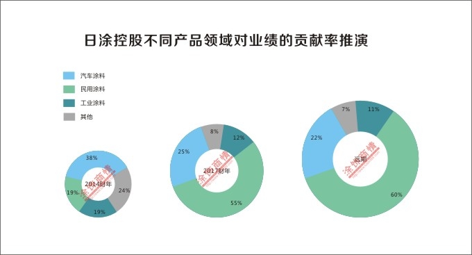 伴随着区域格局的打破,日涂控股以汽车涂料作为第一大产品领域的业务格局也随之发生深刻的变化。得益于主打民用涂料产品的立邦系企业的加入,民用涂料将超过汽车涂料成为日涂控股的“新宠”,远期其业务组成占比将超过60%。
