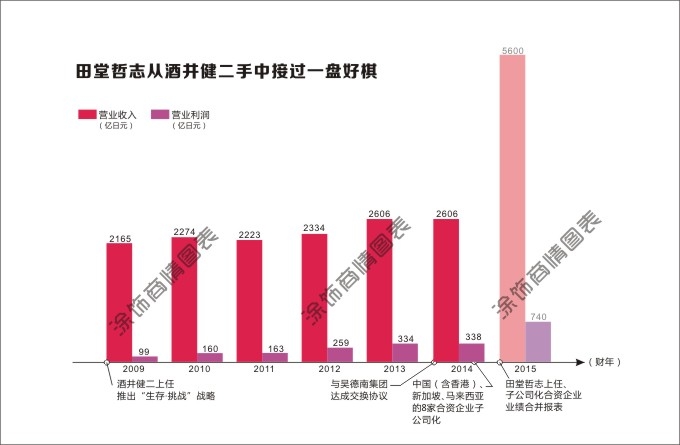 如今“生存·挑战”计划的第一、第二阶段已经完成,如日涂控股所愿,这两个阶段在事业的收益性、效率性方面取得了“一定的成果”。其中在销售业绩方面,经历了稳中有升的过程,年销售额从2009财年的2165亿日元到2014财年的2606亿日元,营业利润从2009财年的99亿日元攀升至2014财年的338亿日元。