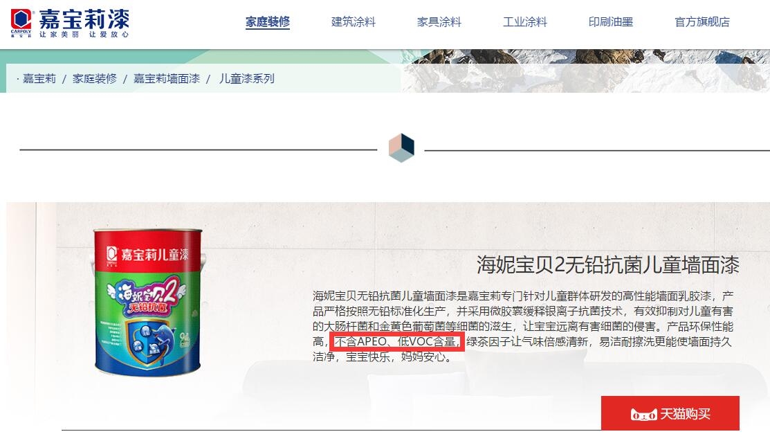 更有意思的是,涂界记者在嘉宝莉官网上还看到,一款名为“海妮宝贝2无铅抗菌儿童墙面漆”的产品,其介绍说“产品环保性能高,不含APEO、低VOC含量,绿茶因子让气味倍感清新,易洁耐擦洗更能使墙面持久洁净,宝宝快乐,妈妈安心。”