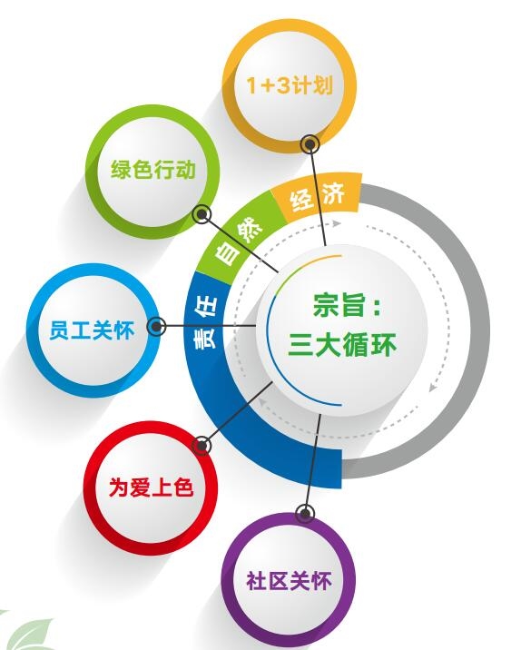 为此,立邦中国将实现企业责任的活动以经济、自然和责任三大循环进行分类,通过1+3计划、员工关怀、绿色行动、为爱上色、社区关怀等五大责任项目,使立邦从自身经济活动层面,环保层面以及弱势群体关怀层面,践行企业社会责任。