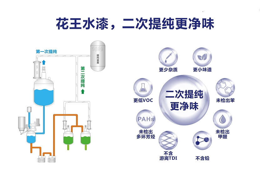 花王水漆的二次提纯技术已经获得了国家乃至世界环保机构的认可。早在2016年,花王水漆产品便开行业之先河,同时获得了水足迹、碳足迹认证;随后又获得了全球最严苛的环保认证之一——“法国室内空气环境检测A+认证”。