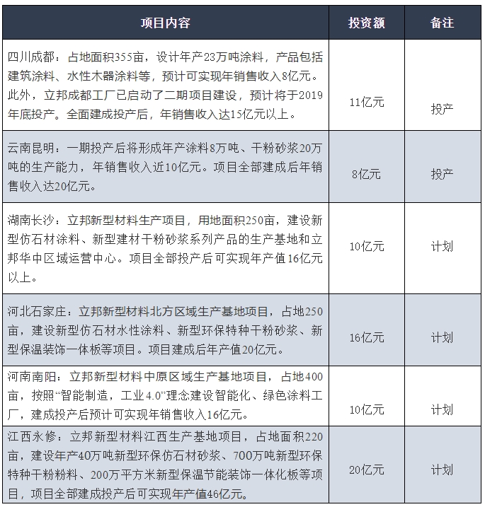 涂界记者注意到,今年以来,立邦在中国建成了四川成都、云南昆明两大绿色智能涂料工厂;此外,还计划在湖南长沙、河北石家庄、河南南阳、江西永修新建生产基地,四大项目总投资56亿元,产品涵盖了仿石材涂料、建材干粉砂浆、干粉粉料、保温装饰一体板等,项目全部建成投产后可实现年产值98亿元。