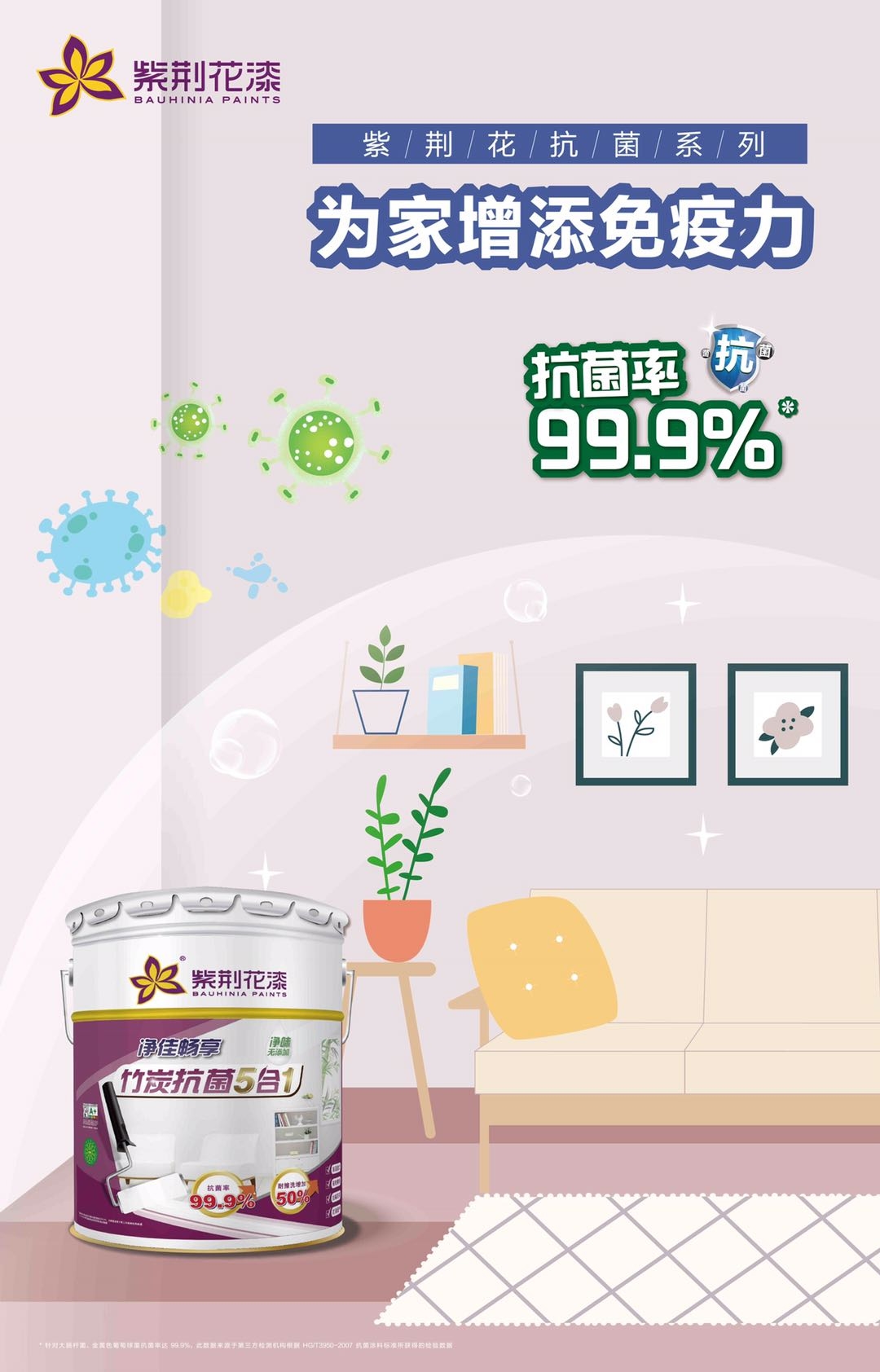 近年来,紫荆花一直致力于突破传统涂料技术边界,利用创新和环保为中国家庭缔造高性能且可持续发展的产品和服务。连同此次新上市的涂倍安99抗菌墙面漆产品在内,紫荆花目前已经推出了多款适用于不同人群及场地的抗菌涂料,比如:紫荆花贝倍安儿童漆、紫荆花优涂丽S3竹炭抗菌无添加强化面漆,以及紫荆花净佳畅享竹炭抗菌5合1墙面漆等。作为紫荆花“抗菌家族”,它们能长久有效抑制墙面细菌的滋生,降低或阻断病菌传播渠道。