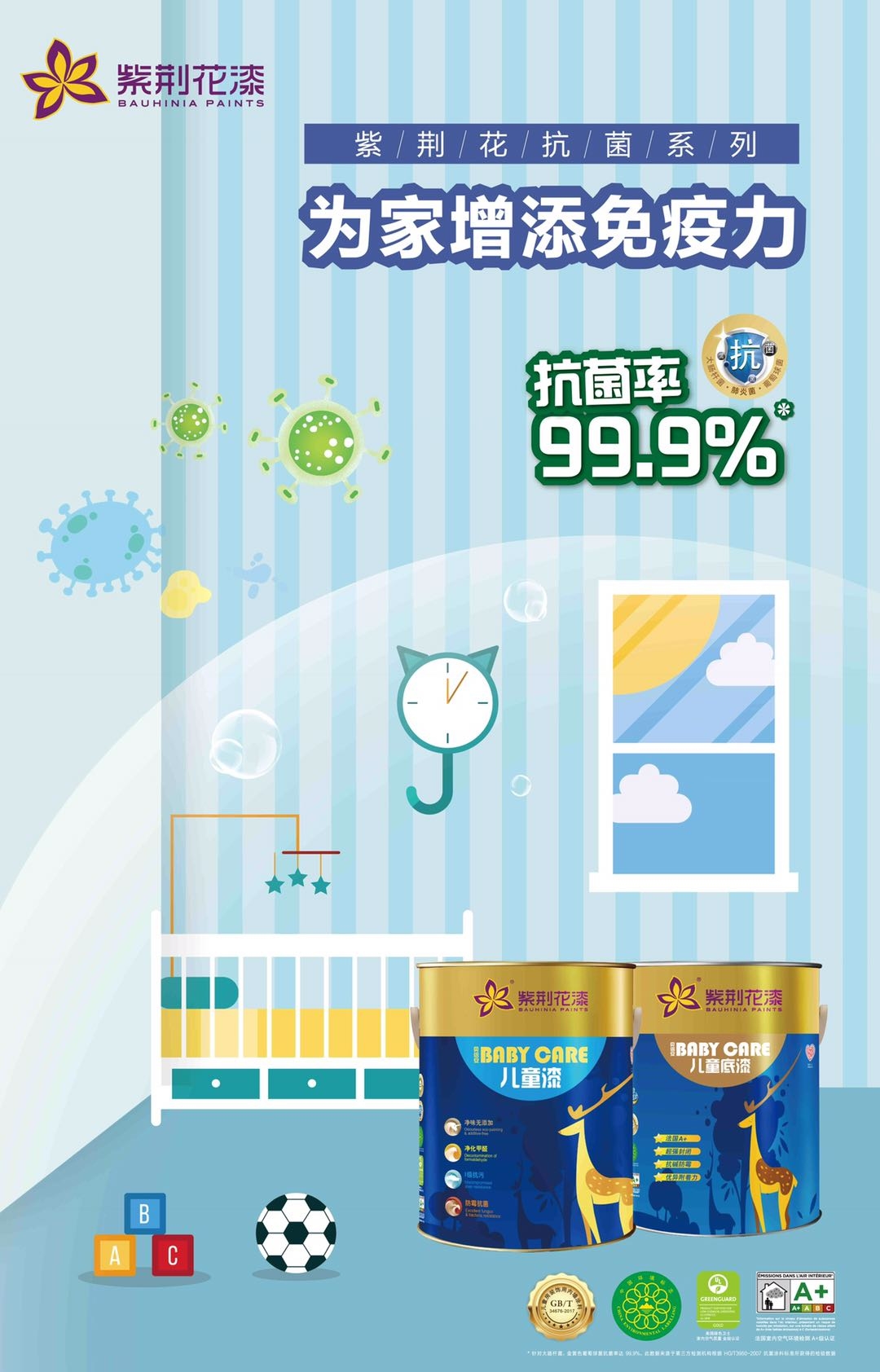 紫荆花贝倍安儿童漆,专为儿童定制,可有效抵抗肺炎克雷伯氏菌、大肠杆菌及金黄色葡萄球菌等多种细菌,达到抗菌性能Ⅰ级要求。该款儿童漆还采用了净味无添加和净化甲醛配方,能持续净化室内空气,为儿童健康成长保驾护航。据悉,贝倍安儿童漆已获美国GREENGUARD(绿色卫士)室内空气质量金级认证、法国VOC检测A+认证等多个国权威际环保认证。