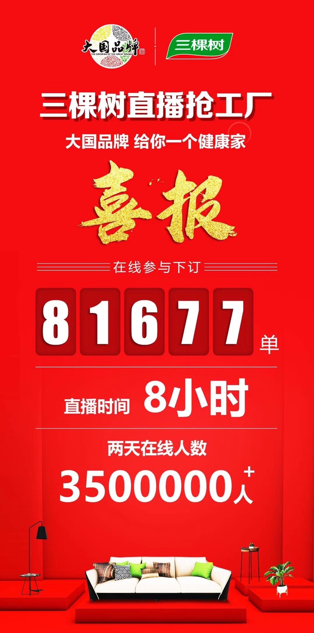 就在3月30-31日短短的两天八小时内,三棵树“直播抢工厂”创造了行业奇迹:8小时线上成交达81677单,销售额突破4个亿,两天在线人数达到350万+人次!三棵树首次开启线上“直播抢工厂”活动便取得如此漂亮的成绩,这背后究竟有何秘诀?