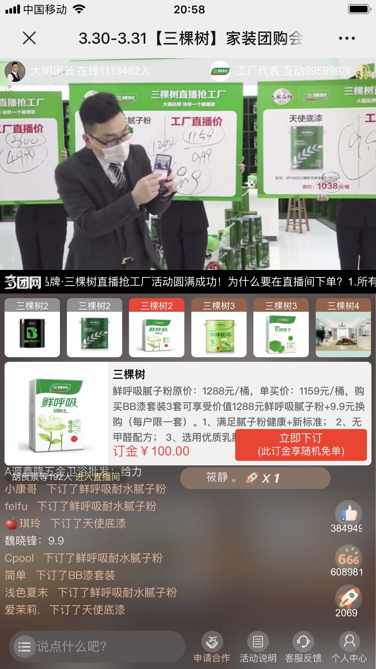 八个小时的直播,优质产品为三棵树带来效果不俗的线上带单。为最大力度回馈消费者,直播期间,马上住新刷服务、艺术背景墙套餐、健康漆……活动产品全部低于成本价秒杀!三棵树BB漆、净味360抗菌墙面漆等明星产品,全部以低价进行秒杀,其中:9.9元秒到1288元20袋高端腻子,39.9元可以秒到1428元1套强力抗菌漆,99.9元可以秒到6238元1套顶级儿童漆!此外,99.9元可以秒到5980元/套艺术漆儿童房套餐。