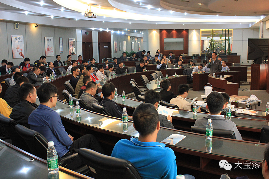 工程部水性专案课屈师来对水性木器涂料相关内容的讲解则成为会议的重点。他主要从水性木器漆在国际、国内的发展概况,东莞大宝化工水性木器漆研发状况以及大宝水性木器漆的性能、特色等方面进行详细讲解。