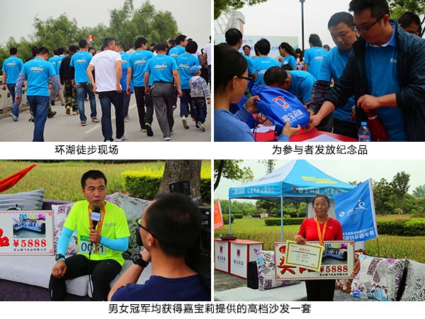 活动当日天公作美,共有100人参加半程马拉松赛,而参加5公里环湖徒步的选手多达300余人,期间还不断有人加入。最终,来自江西的小伙谢斌和来自安徽的退休大妈周惠琴,以绝对优势分获男子组和女子组半程马拉松赛冠军,除证书和奖金外,还收获了锦飞实业提供的高档沙发一套,而参加徒步大会的选手,也获得了嘉宝莉提供的精美礼品袋一份。