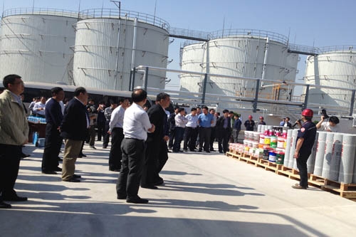 各位领导对一期工程包括卷材车间、卷材库房、储罐区等已建的重点工程进行了观摩,东方雨虹唐山生产基地厂长靳曦对公司、产品及唐山生产基地的建设情况及投资计划等进行了详细的讲解。