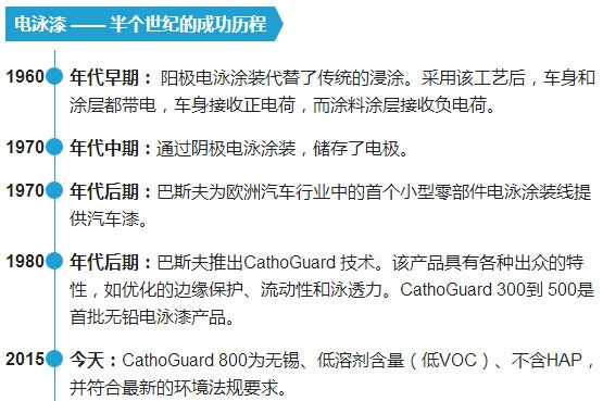 在汽车车身的涂装工序中,电泳漆被用作白色车身的底漆,是后续涂层的基础,能够有效防止表面、边缘和车身受到腐蚀,因此在全球各地广为应用,备受汽车制造商的欢迎。巴斯夫作为全球领先的汽车涂料供应商之一,其环保型CathoGuard 800电泳漆在业内声名显赫。