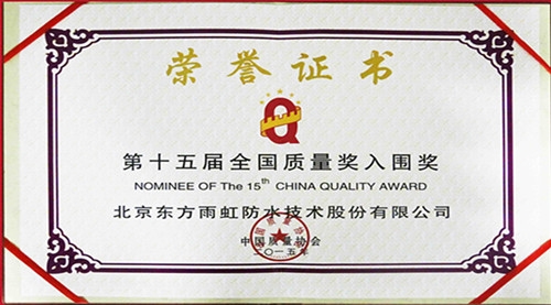 11月4日,全国追求卓越大会在京召开。中国质量协会公布第十五届全国质量奖推荐获奖名单:全国 9家组织获第十五届全国质量奖,4家组织获全国质量奖入围奖,4个项目获全国质量奖卓越项目奖。北京东方雨虹防水技术股份有限公司凭借在质量、绩效管理等方面取得的显著成绩,荣获第十五届全国质量奖入围奖(组织奖)。