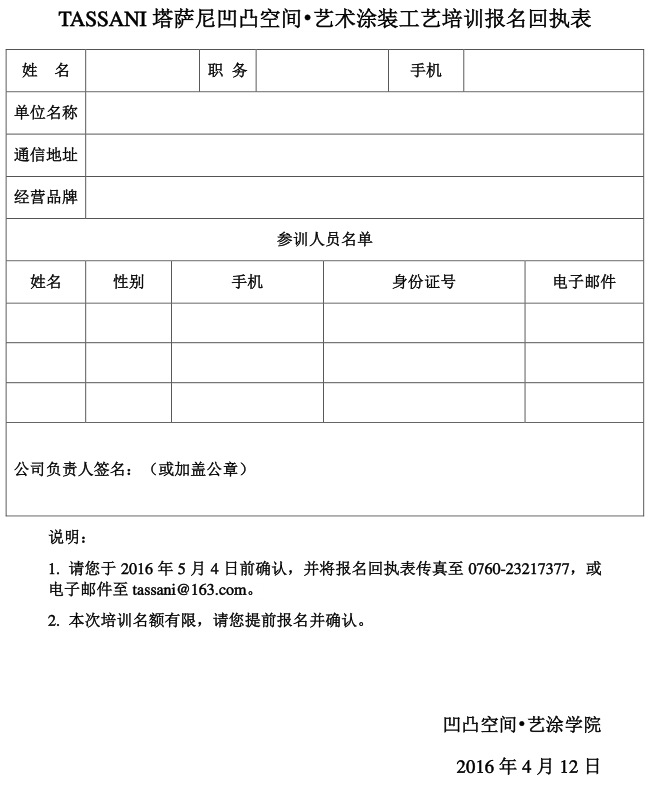2. 请填好报名回执表(见附件),于5月4日之前传真或Email回TASSANI塔萨尼凹凸空间艺术涂装培训学院。