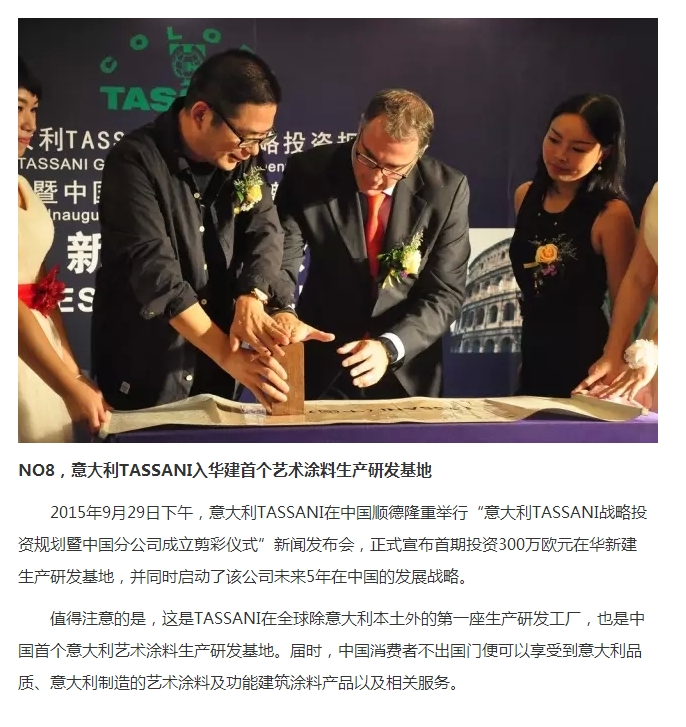 2015年12月28日,《涂界》评选出的2015年度涂料行业十大国际新闻,“意大利TASSANI入华建首个艺术涂料生产研发基地”位列其中,其中“中国民族涂料工业迎诞生100周年”、“世界涂料企业100强榜单发布”、“PPG超越阿克苏诺贝尔夺得全球涂料霸主”、“杜邦与陶氏化学宣布合并 市值1200亿美元巨无霸诞生”等入选。