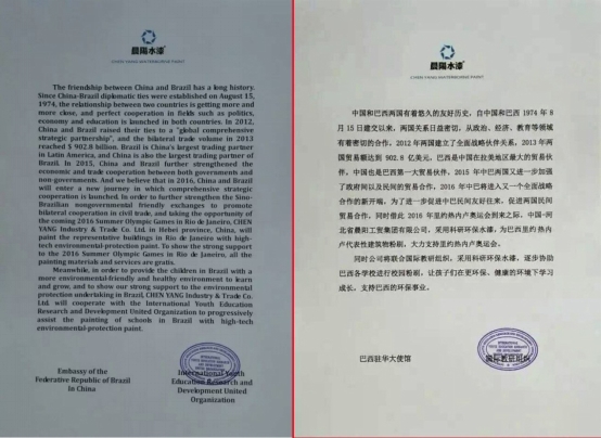 据悉,晨阳水漆还将联合国际教研组织,采用环保水漆对巴西各学校进行粉刷,让孩子们在更环保、健康的环境下学习成长,支持巴西的环保事业。