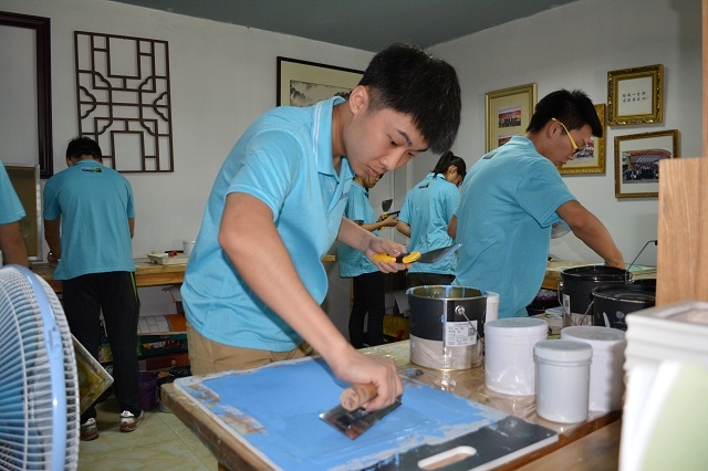 非常高兴能够来到TASSANI塔萨尼中国进行实习。起初还有点紧张会适应不了这里的学习和生活,但是公司的职员都非常热情的迎接我们,为我们解决生活上遇到的困难,让我很快的适应了这个陌生的环境。由于我们来实习的人数比较多,公司将我们分配到几个部门里进行轮岗学习。在几周的轮岗中我了解到油性、水性以及乳胶漆的应用,颜色的调配,并且还深入地进行液态壁纸的制作,对漆料的滚涂、拍花、擦色、印花有了更进一步的熟练。