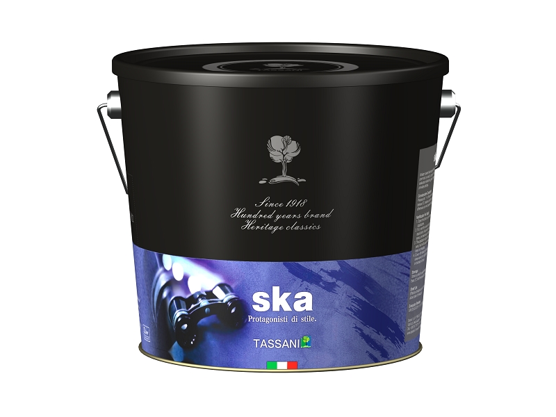 TASSANI塔萨尼Ska水性艺术涂料面漆,适合室内及室外使用。该产品采用何克乳胶聚合技术,结合欧盟环保耐水佩服,具有友谊防潮耐水和低柔韧性、硬度高,能有效覆盖细微裂纹,防尘性能优异,漆膜具有超强抗污功能,适合酒店及商业场所大面积墙面装饰效果。