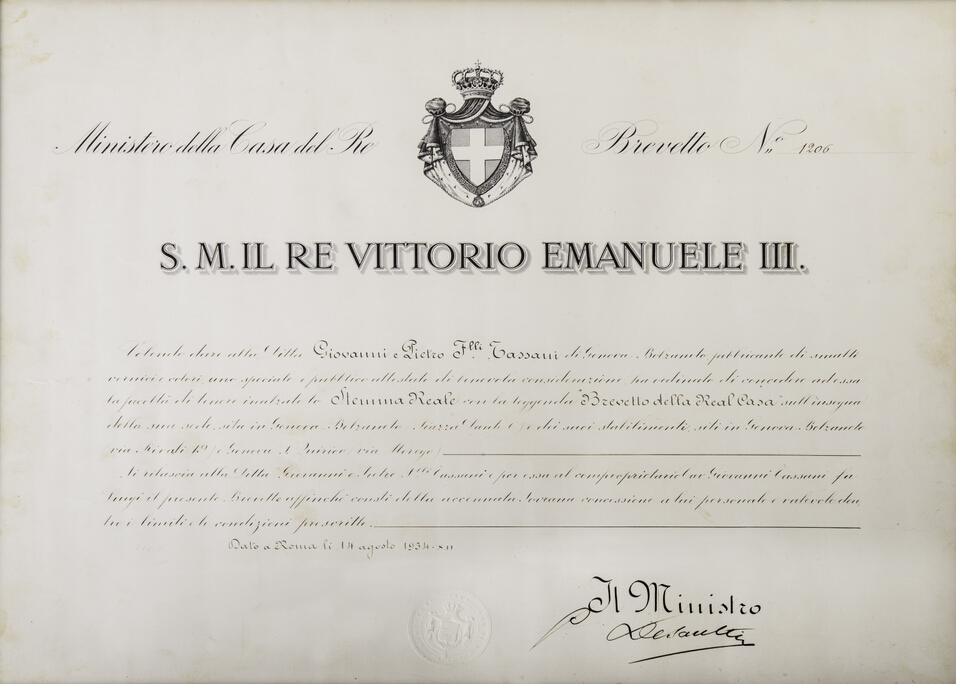 ★1934年,TASSANI塔萨尼产品被应用于意大利皇室建筑,并获得了意大利皇室颁发的“意大利皇室奖”,成为意大利最优秀的涂料制造商、销售商之一。
