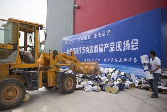 武汉双虎集中销毁价值200多万元假冒涂料