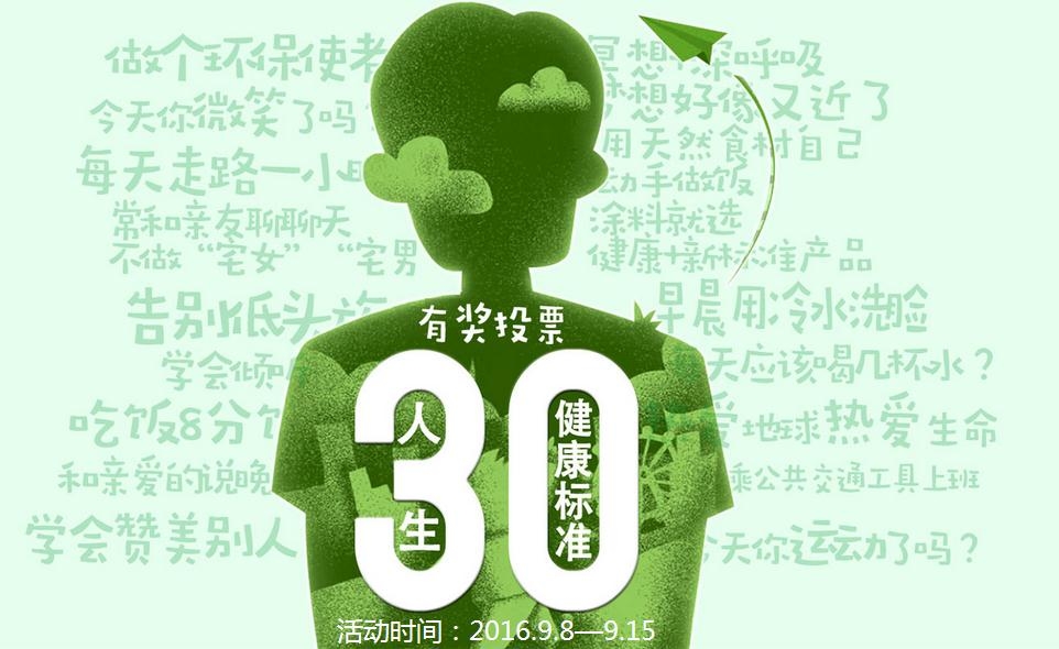 世界卫生组织曾对影响健康的因素进行过总结:健康=60%生活方式+15%遗传因素+10%社会因素+8%医疗因素+7%气候因素。由此可见健康的生活方式管理是个人健康管理的一个重要的策略。健康的生活方式是需要培养的,培养的主动性则要靠自己,生活方式管理的观念就是强调个体对自己的健康负责,它还可以通过社会化营销,营造健康的大环境,促进个体改变不健康的行为。三棵树的企业健康学不仅提倡健康产品,始终保持“健康性能,领先队友”的产品理念以及超前的创新思维、精细的研发标准和严格的品质监控,还坚持以社会为己任主动承担起传播健康文化的责任,积极主动地营造良好的健康氛围。“人生30健康+新标准”票选活动正是三棵树又一次成功的营销活动。