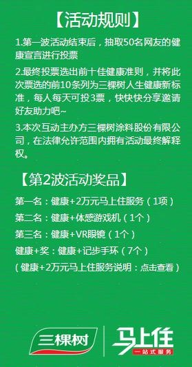 由三棵树举办的“人生30健康+新标准”全网征集活动完美落下帷幕,经过三棵树内部工作人员层层选拔,共有50条健康宣言入围线上票选。“人生30健康+新标准”的活动分为“征集”和“票选”两个流程,本次活动在征集环节就得到了广大网友的热情响应,收到几千余条健康宣言,而哪10条健康宣言会成为三棵树人生健康新标准,这一决定权将继续交给广大网友,三棵树人生健康新标准由你决定,抓紧时间来为自己喜欢的健康宣言投票吧!