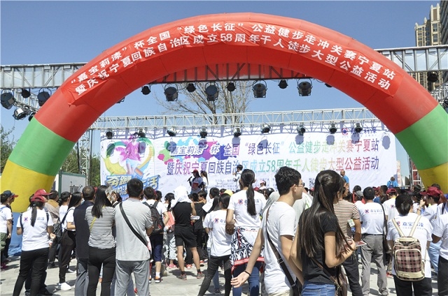 “绿色出行 公益相伴”。9月11日,适逢我国穆斯林的盛大节日古尔邦节,为庆祝抗战胜利71周年暨宁夏回族自治区成立58周年,“嘉宝莉漆”杯银川千人徒步大型公益活动在美丽的黄河之滨、贺兰山下举行。2000多位徒步爱好者从金茂建材城出发,途经丽景街、北京路、金波街到达西夏万达广场,全程18公里。不设竞技奖项,不限时间方式,徒步者既得到了锻炼和健身,又享受到了与家人、亲朋共度周末的乐趣。