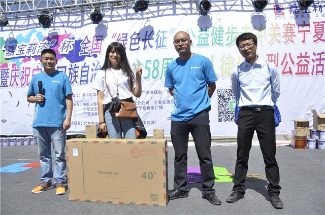 不少走完全程的徒步者现场,活动期间和活动当天购买嘉宝莉漆的消费者和涂装师傅,均幸运地抽得了40寸创维晶电视机、吸尘器、美的电磁炉、小米充电宝等精美大奖。有50 多位徒步爱好者还因为转发活动当天的精彩图片到微信朋友圈,幸运抽得了VIVO X7手机、原汁机、美的电磁炉等惊喜大奖。来自西夏区的王先生在抽得创维晶电视机时激动地表示,这是一个非常有意义的活动,不仅锻炼了身体,丰富了周末生活,还在活动过程中认识了很多新朋友,抽得大奖更是意外的收获,感觉比过年还兴奋。以后自治区如果有类似活动,他一定第一个报名参加。