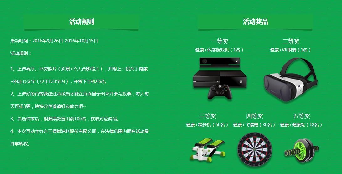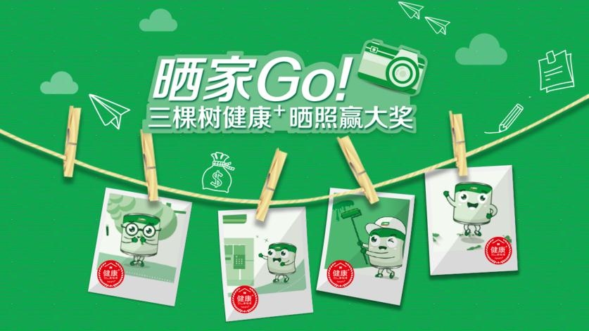 9月28日,“晒家GO!三棵树健康+晒照赢大奖”主题活动正式上线,在9月28日至10月15日期间,广大网民可关注三棵树官方微信报名参加活动,拍一张客厅或者书房的照片,再加一段关于家的走心文字,然后参赛者可以通过各种方式为自己拉票,票数最多的前100名将获得“健康+”体感游戏机、“健康+”VR眼镜、“健康+”踏步机等等丰厚奖品。