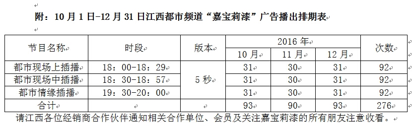 从今年10月1日开始至年底,嘉宝莉海藻泥2代产品形象广告将强势登陆江西都市频道。播出时间为每天黄金时间,18:00-18:57在都市现场插播,19:30-20:00在都市情缘插播。播出版本统一为海藻泥2代5秒钟形象广告片。这是是嘉宝莉近几年继投放央视、江苏卫视、浙江卫视、湖南经视等电视广告后,首次在江西地方台投放广告。