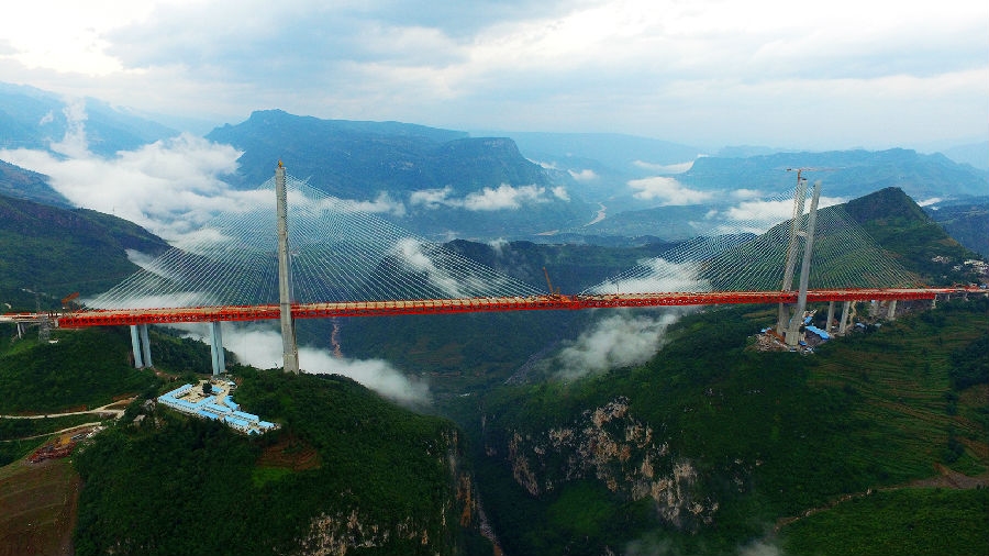 北盘江大桥坐落于云南宣威与贵州水城交界处,横跨云贵两省,全长1341.4米,桥面到谷底垂直高度565米,成为目前世界第一高桥。同时,大桥东、西两岸的主桥墩高度分别为269米和247米,720米的主跨,在同类型桥梁主跨的跨径中排位世界第二。