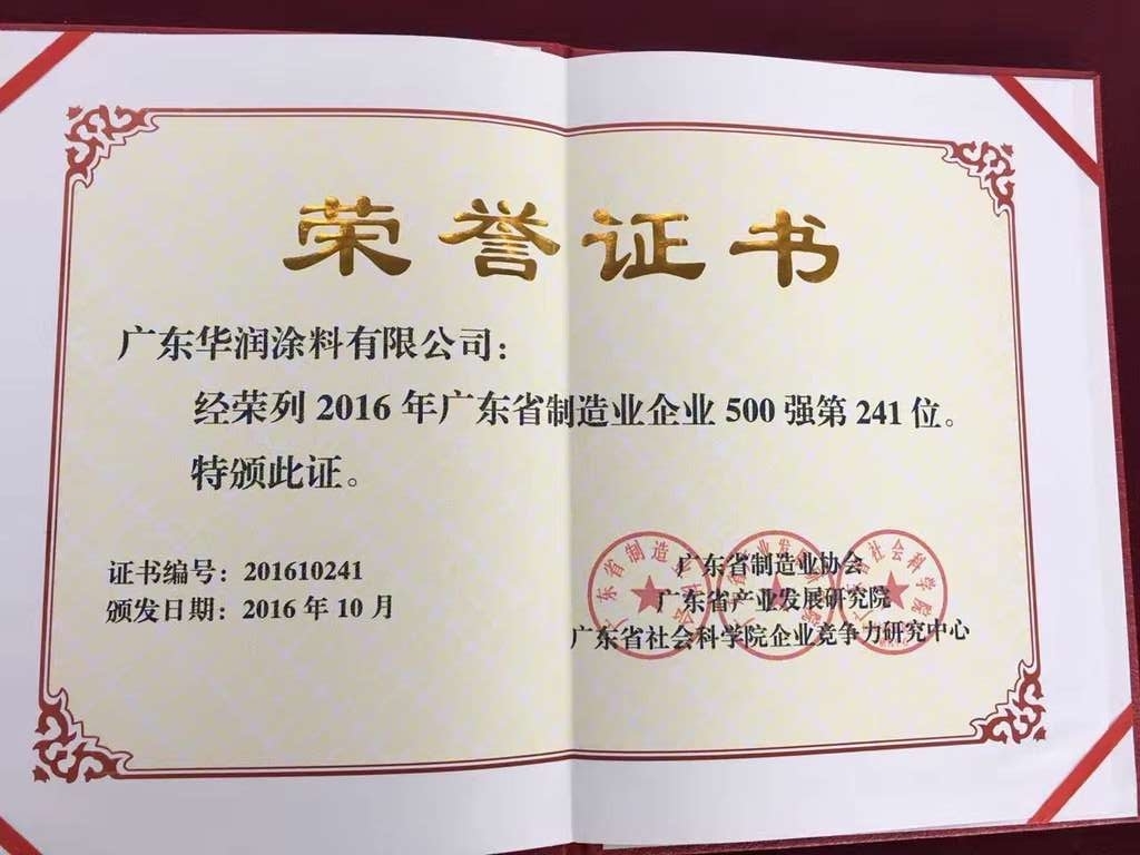 10月13日,2016广东省制造业发展年会暨广东制造业500强企业峰会在珠海召开,大会公布了“2016广东制造业500强企业”名单。据悉,广东华润涂料有限公司首次入选该榜单并位居第241位。