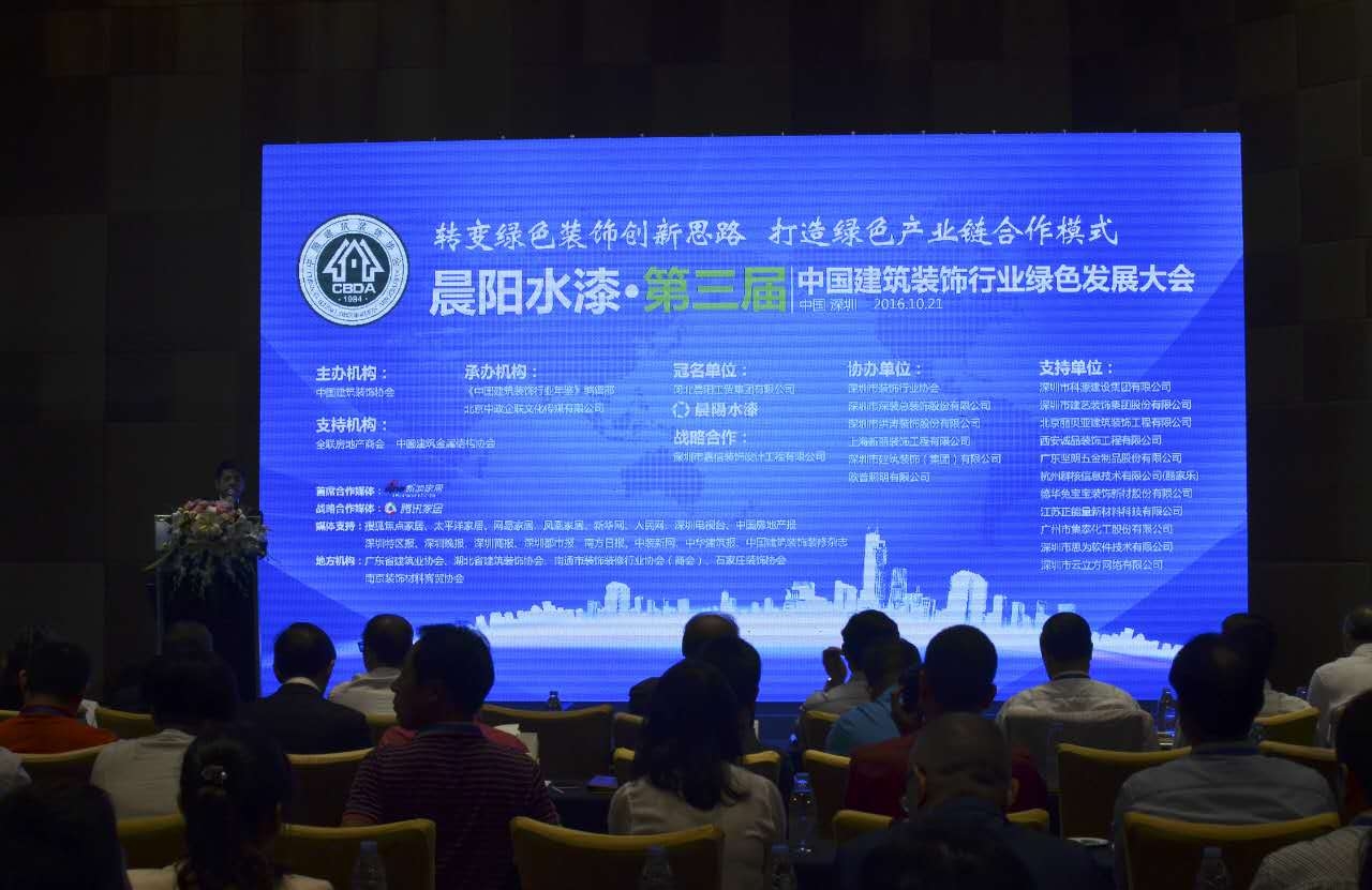 为促进我国住房和城乡建设领域的绿色建筑与绿色建筑装饰的深入开展与合作,10月21日,由中国建筑装饰协会主办,河北晨阳工贸集团有限公司冠名的“晨阳水漆•第三届中国建筑装饰行业绿色发展大会”在深圳举行。