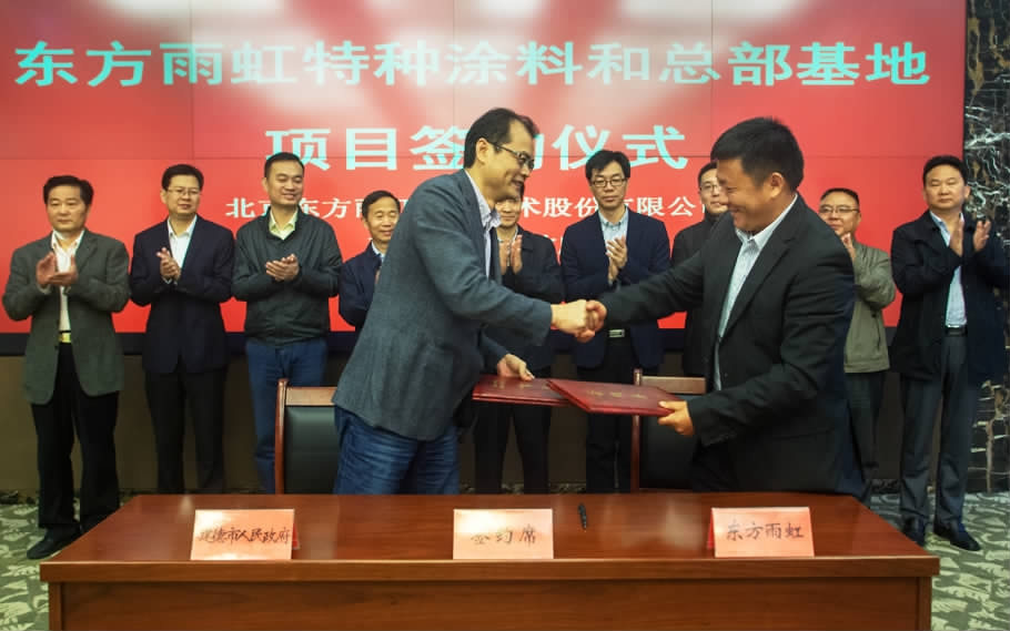 据了解,此次签约的东方雨虹特种涂料和总部基地项目预计用地500亩,计划总投资达15亿元,基地将引进德国高端生产线和设备及专业技术人才,目标通过10年时间,建设成为全国单体销量最大的涂料生产基地,实现产值30亿元-50亿元。