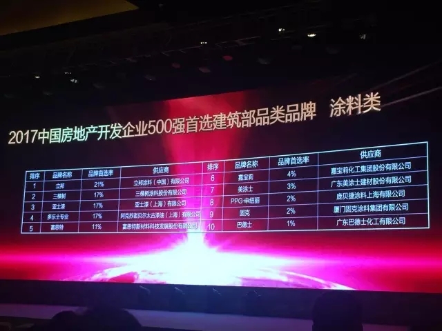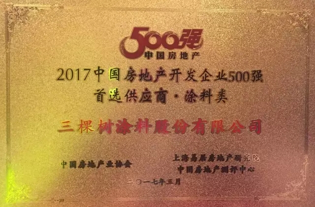 此次会议上,三棵树再次以17%首选率问鼎首选品牌行业10强,荣获“2017中国房地产开发企业500强首选涂料类品牌第二名”,更是以19%的首选率在华北及西北地区占据首选品牌头名。三棵树自2011年起连续六年蝉联该榜单,充分展示了企业雄厚的产品实力及良好的品牌口碑。