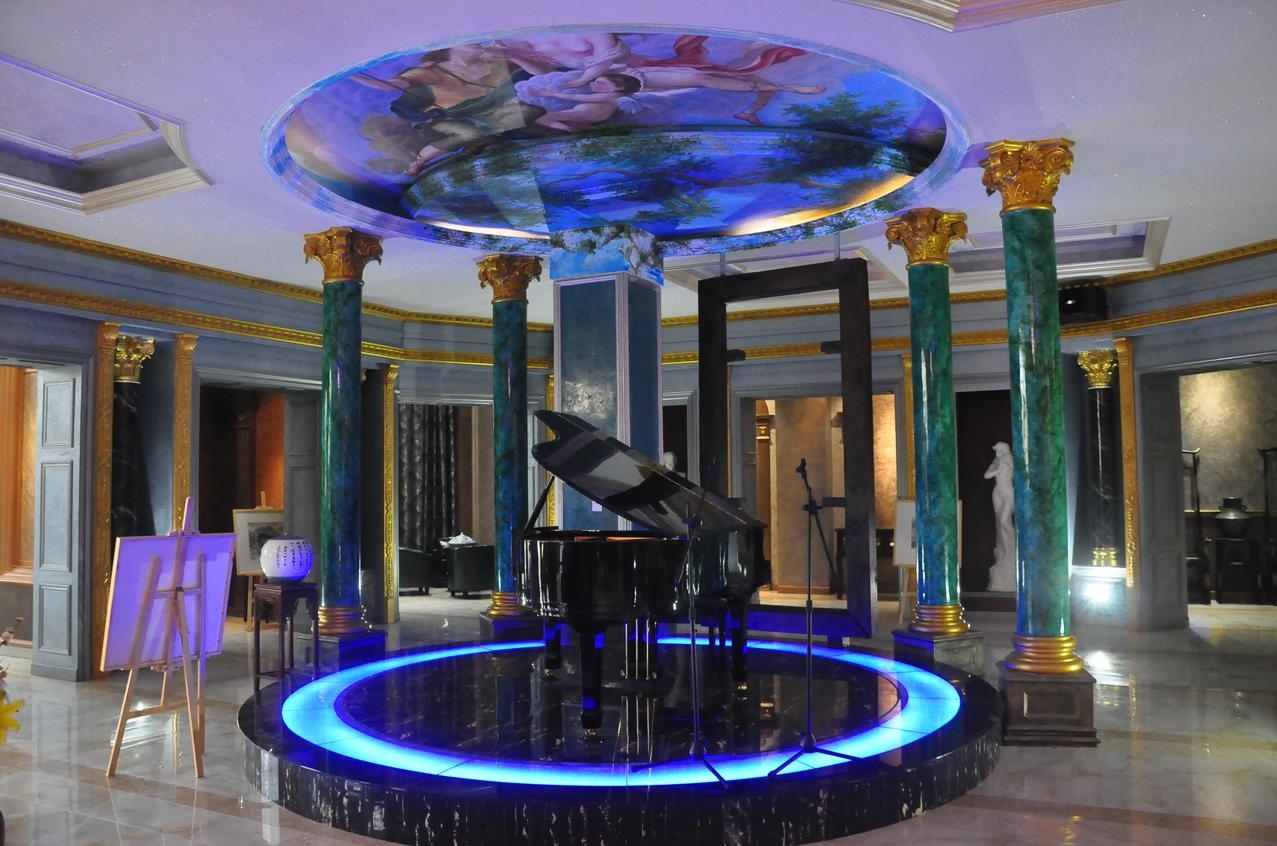 从整个展示厅来看,内立面装修全部使用的是艺术涂料,用到了TASSANI塔萨尼十八个不同系列产品,设计出了各种不同的工艺效果;展厅中还有一大特色,那就是所有墙面的工艺效果及壁画都是经过精心设计的,然后用历史典故贯穿于整个展厅,这就赋予了展厅更深的文化和艺术内涵。
