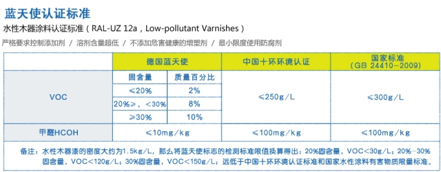 据了解,德国“蓝天使”认证规定,VOC含量不大于700mg/kg,甲醛含量不大于10mg/kg。但按照我国的环保标准,涂料产品的挥发性有机物(VOC)含量是200g/升,而带有德国“蓝天使”认证的涂料产品是0.15g/升,两者相差大约为1300-1400倍的有害物质含量。