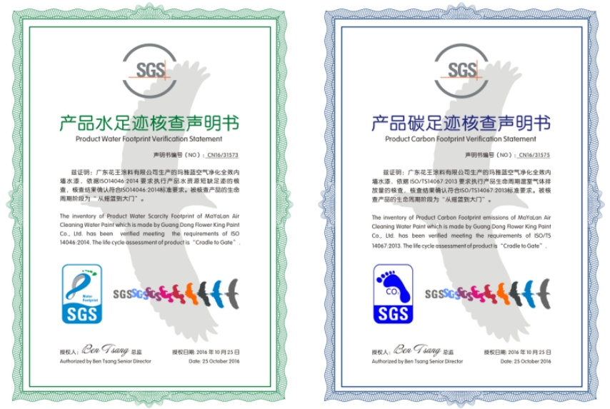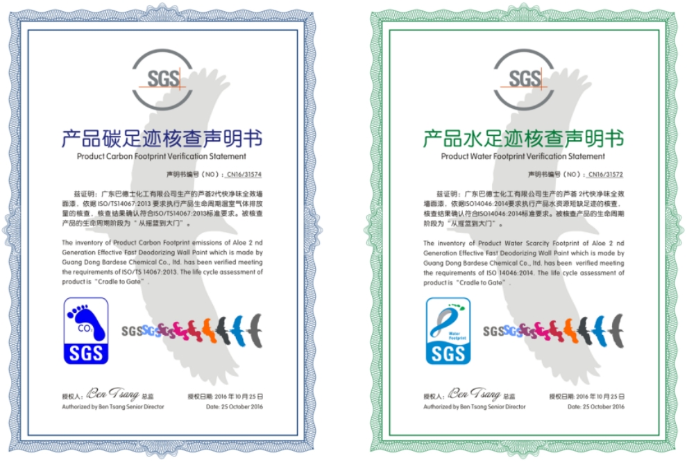 据介绍,此次认证的产品系列分别为花王水漆品牌旗下“玛雅蓝水性内墙漆”、巴德士品牌旗下“芦荟2代快净味墙面漆”,此次对这两大系列产品从原材料获取、产品制造过程和运输过程中的碳足迹、水足迹进行计算,为其后续评价该产品环境绩效、产品碳减排、碳中和、水资源消耗提供了有效参考。通过产品碳足迹、水足迹标识有效的向市场传递了企业对低碳环保、水资源节约的关注,树立了可持续发展的品牌形象。