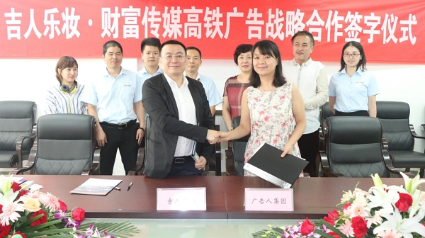记者了解到,为了在快速成长期进行战略性的广告投入,占领潜在用户心智,2017年8月中上旬,吉人乐妆与北京财富传媒达成战略合作,签订了价值2亿元的高铁广告协议,其广告将覆盖京哈线、京广线和沪深线,横跨15个省、近百个主要城市。
