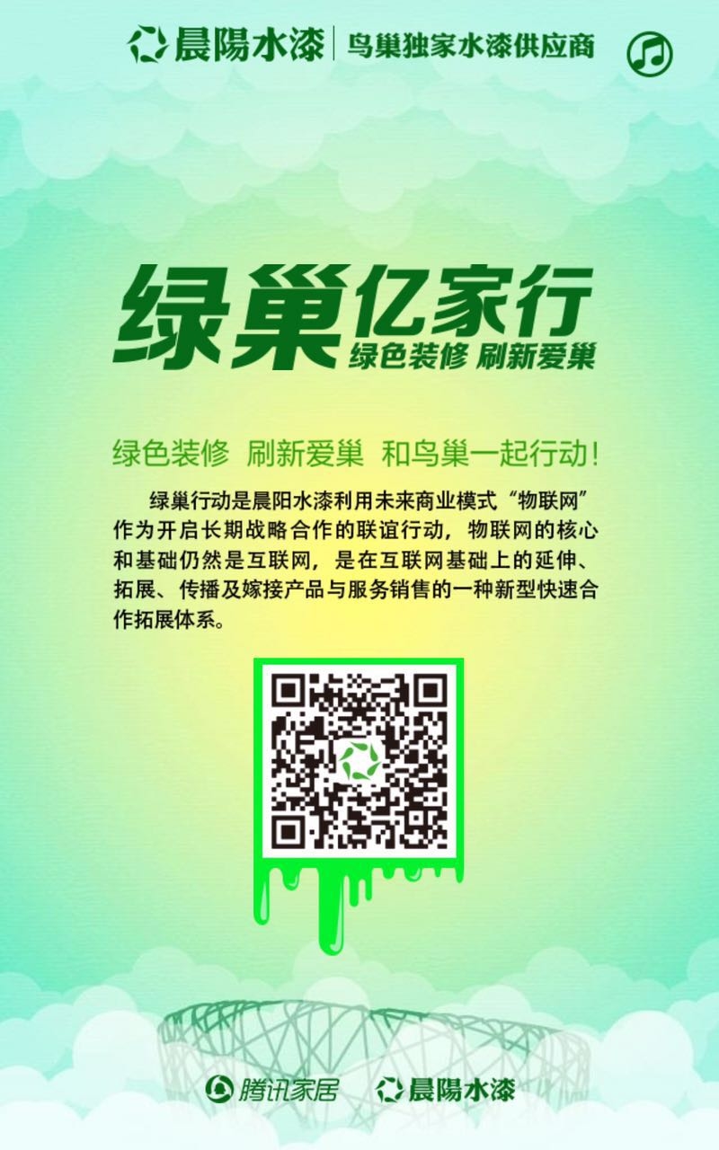 晨阳水漆联合家装公司开展此次绿巢亿家行活动,让经销商与家装公司形成长期互联共赢合作的关系。保障消费者享受到更高品质的商品和服务。物联亿家行就是共同联合为祖国的绿水青山着想、为子孙后代着想、为人类健康着想、为蓝天白云着想。